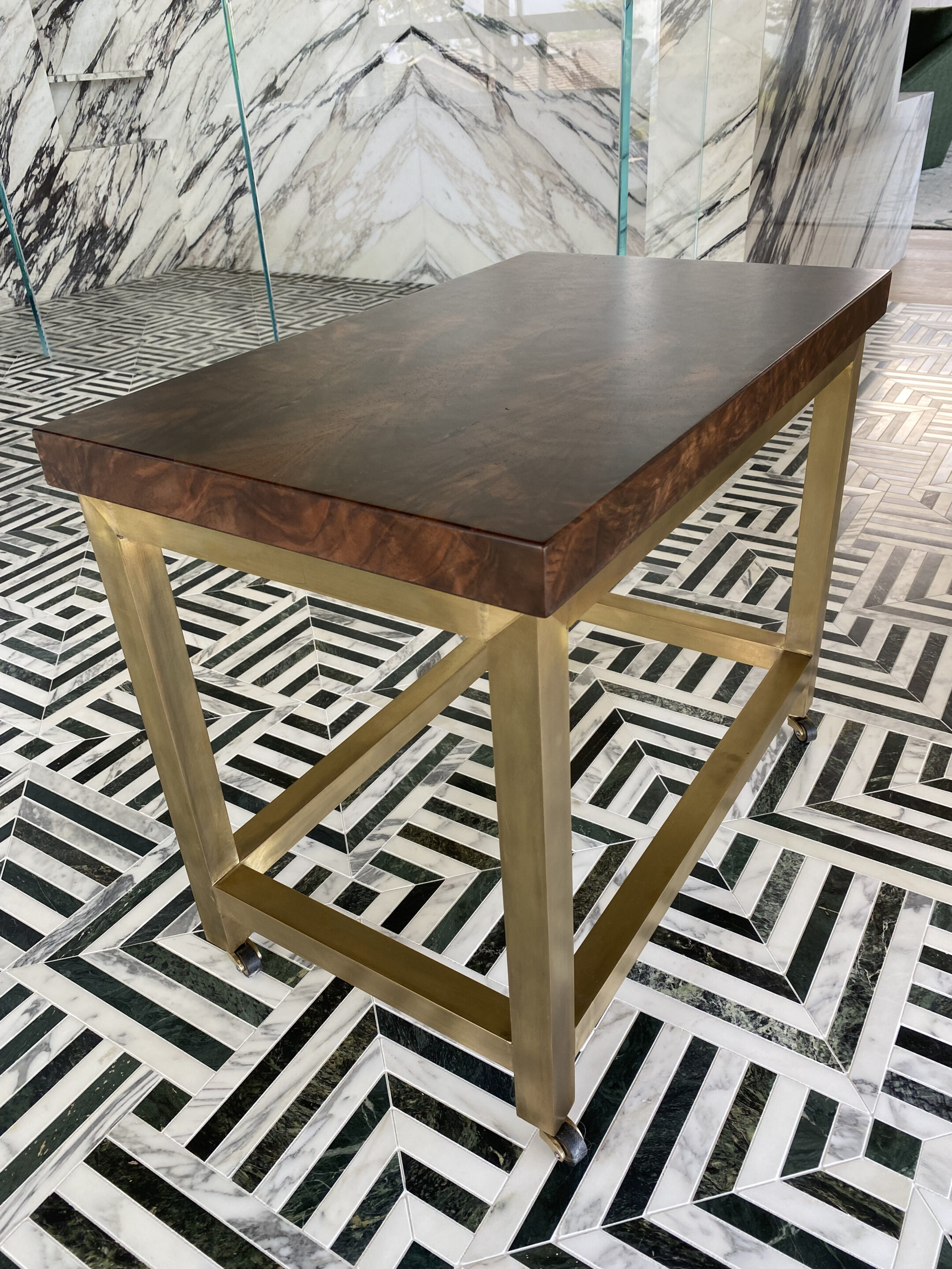 This piece features a custom wood birch seat set upon a brass base, originally designed as part of a vanity room collection. The base is crafted from architectural bronze alloy 385 and finished with an antique bronze patina.